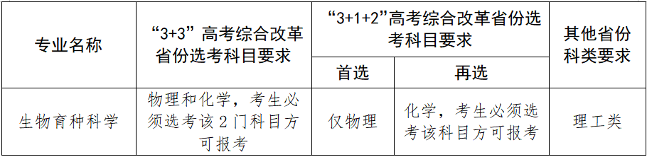 我校2023年强基计划招生专业为生物育种科学,招生专业选考科目或科类要求见下表。
